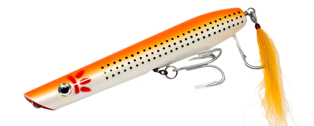 Tsunami Timber Lure Pencil Popper Plugs do a great job of attracting fish. Pop and slash this lure to imitate fleeing baitfish, or reel it in slowly with a "walk-the-dog" action that game fish can't resist. Outfitted with VMC® 4X perma steel hooks. Handcrafted from northern basswood with heavy-duty, stainless steel, through-wire construction and split rings. Durable and long-lasting triple epoxy-coated finish. Work it on the surface or use a slow retrieve.